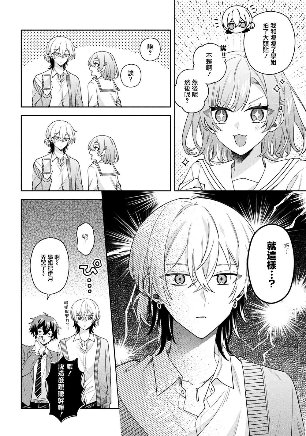 强势难应付的前辈让伊月同学乱了心神!?始了一场一心一意追前辈的恋爱欢喜闹剧。 伊月同学有喜欢的人。她就是——身为风纪委员长的凛凛子前辈。 为了能和她说上话,伊月同学故意不好好穿制服并做了各种努力,但凛凛子总是更胜一筹。 对待感情专一,却让人看了想给他加把劲的伊月同学,他的青春恋爱戏剧由此幕[]幕[-折叠]