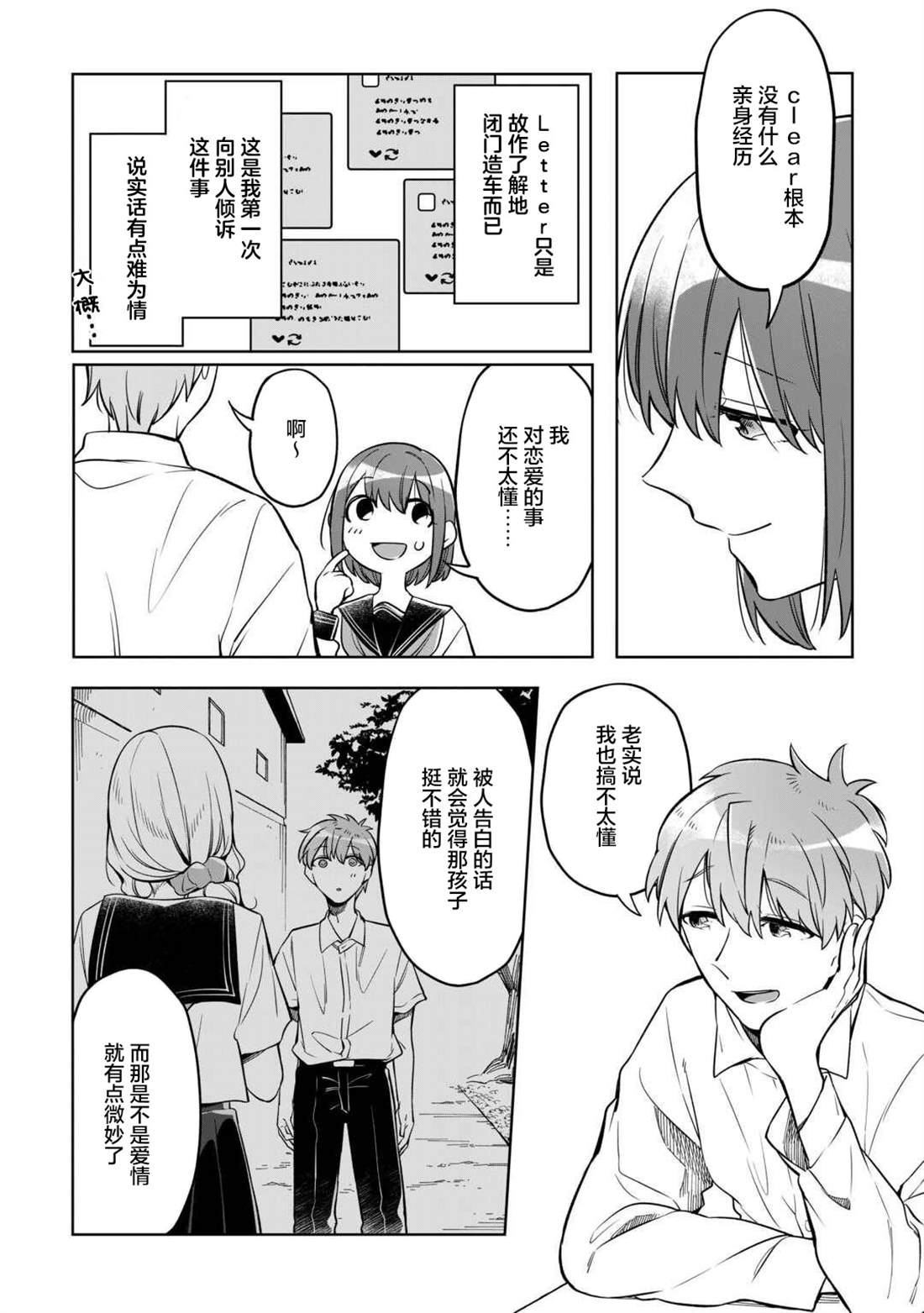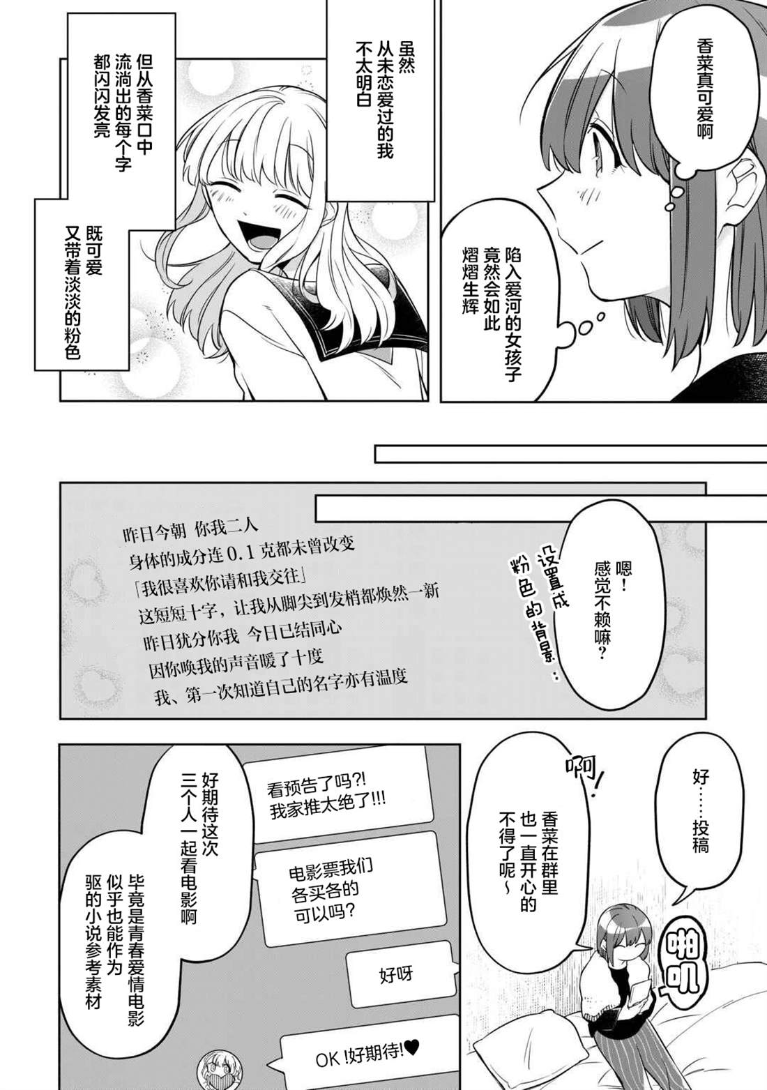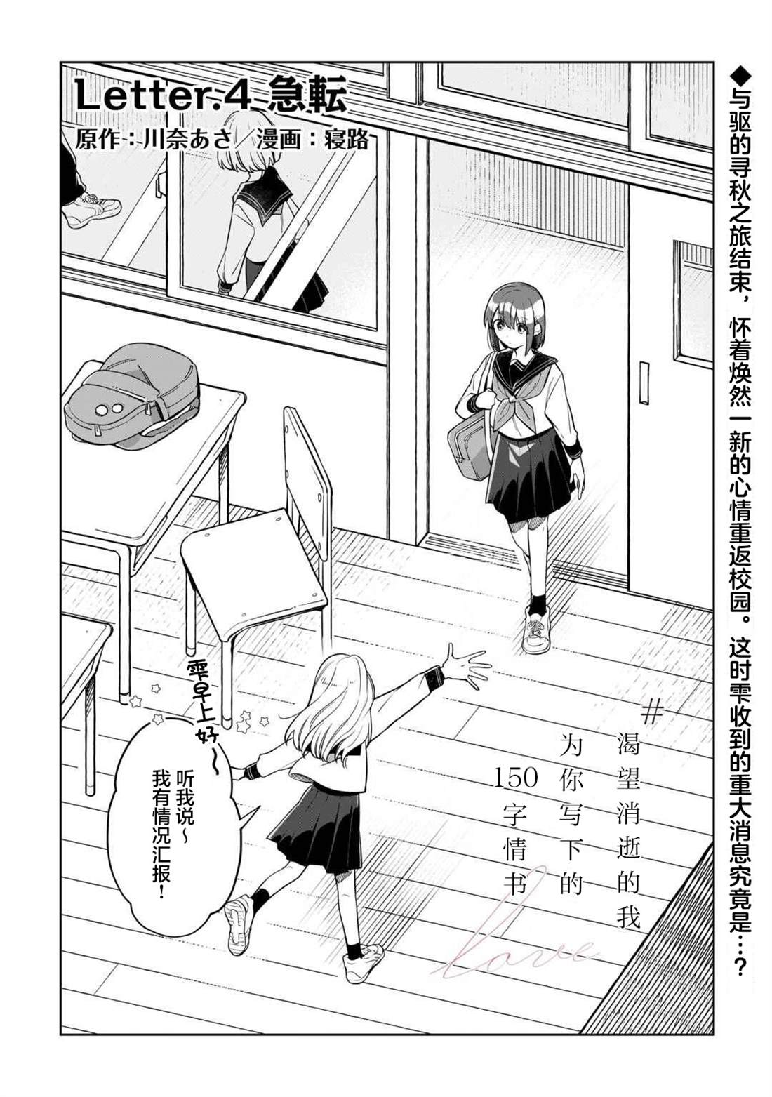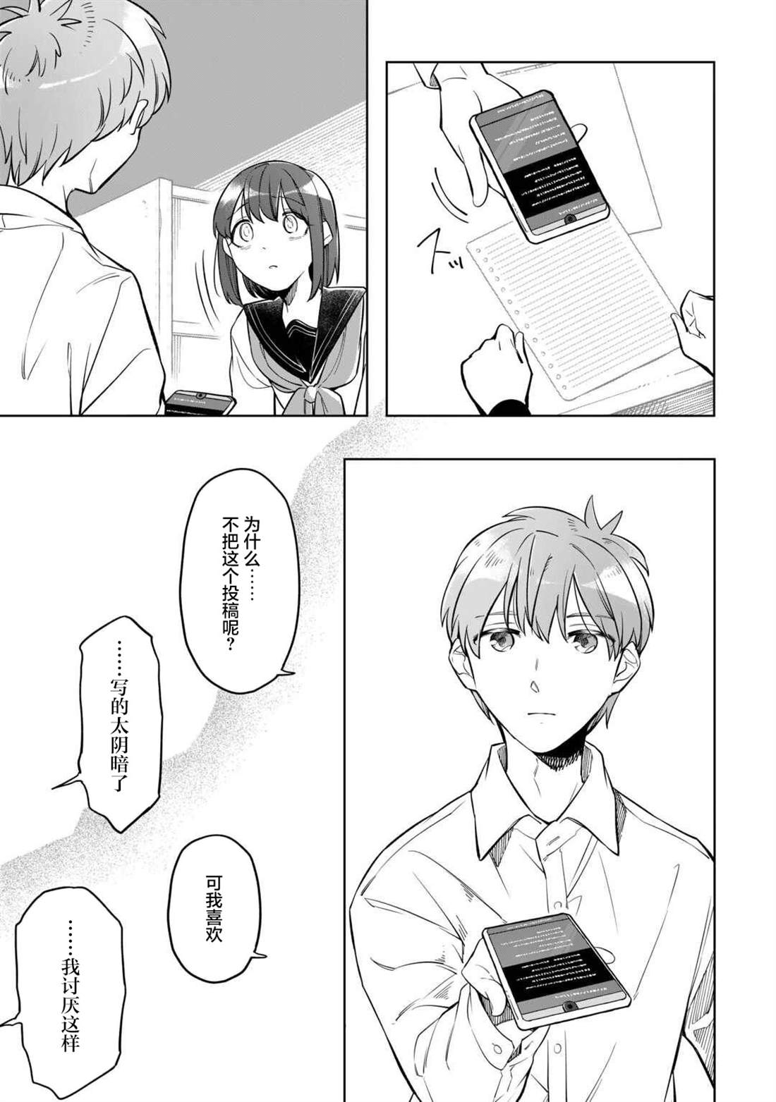 总是在意周围人而压抑自己的雫,每日都会把自己无法倾诉的思绪化作150字的SNS在“Letter”上悄悄投稿。 就这样某一日,同班同学驱为了参加Letter的比赛,提出了“希望能一起创作故事”的请求。为了寻找故事的灵感,向季节与颜色进行探索采风的二人,在结伴同行的这段时间里,逐渐相互吸引,同时,也将[]将相互触及对方心底深处的秘密……!?渴望成为他人却始终透明的二人的故事就此—— 青春小说×V家P杯大奖获奖作品,万众期待的漫画化![-折叠]