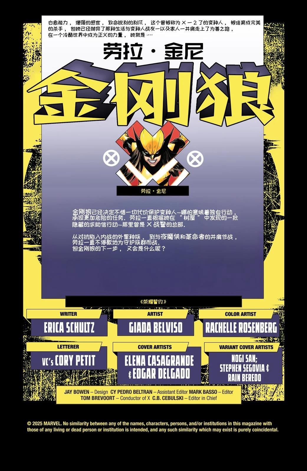 最强大的变种人防御! 金刚狼向所有敌视变种人的势力宣战! 劳拉·金尼曾作为X-23被培育成终极杀手。如今她早已摆脱那段过去,但当目睹变种人被迫违背意愿使用自身能力时,金刚狼决心挺身而出纠正这些不公——无论前路有谁阻拦! 实力派编剧埃丽卡·舒尔茨(代表作《万圣节之夜》《X-23[]3:致命重生》)与新星艺术家贾达·贝尔维索(代表作《血猎人》《惊奇女士年刊》)携手,呈现「浴火重生」时代中金刚狼的首次海外任务。劳拉将追踪并对抗所有隐藏的变种人压迫者[-折叠]