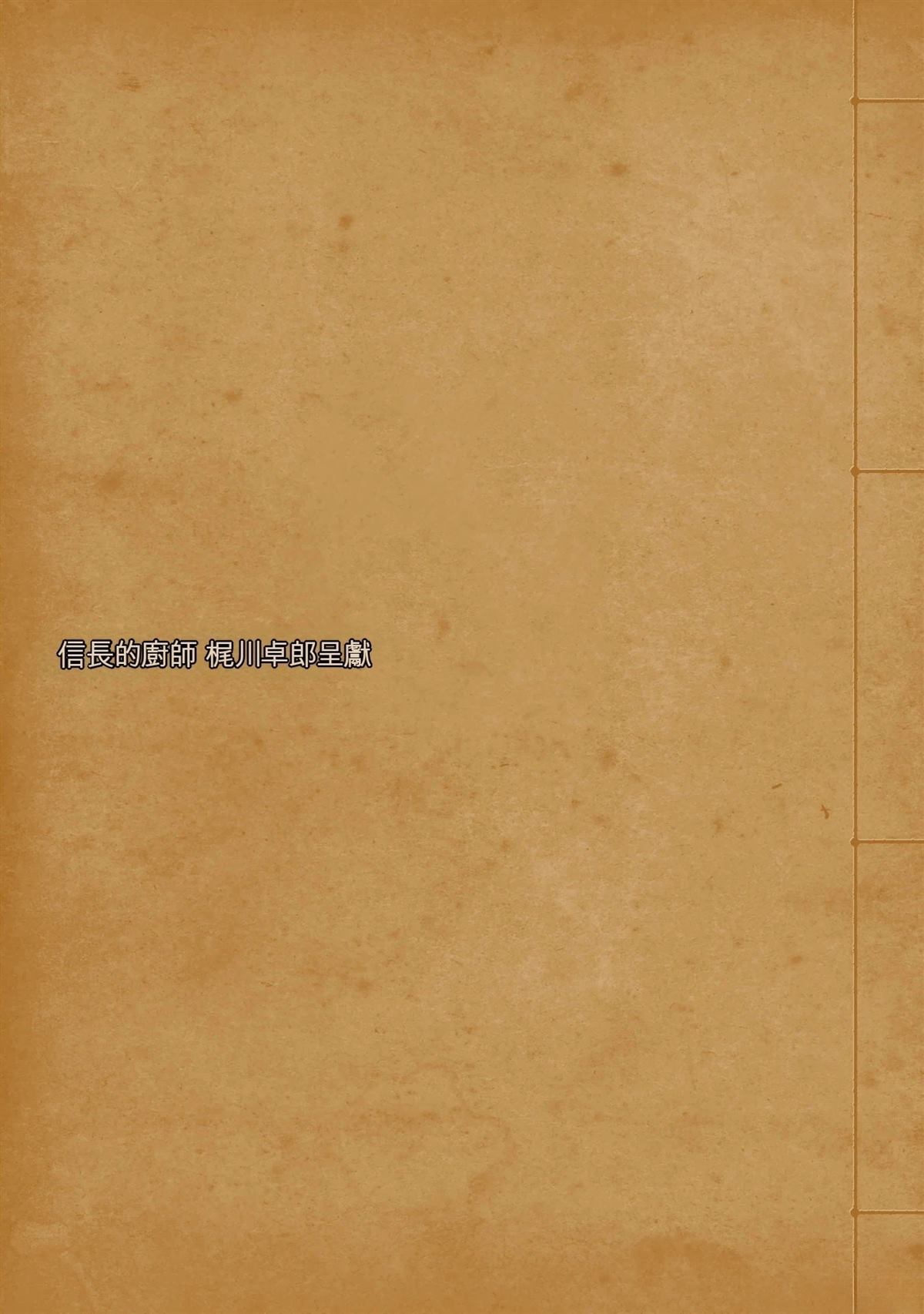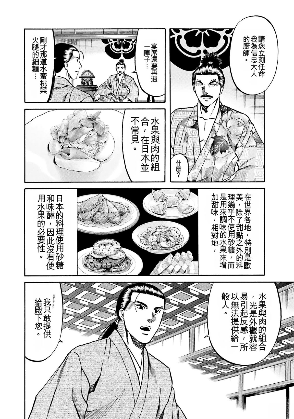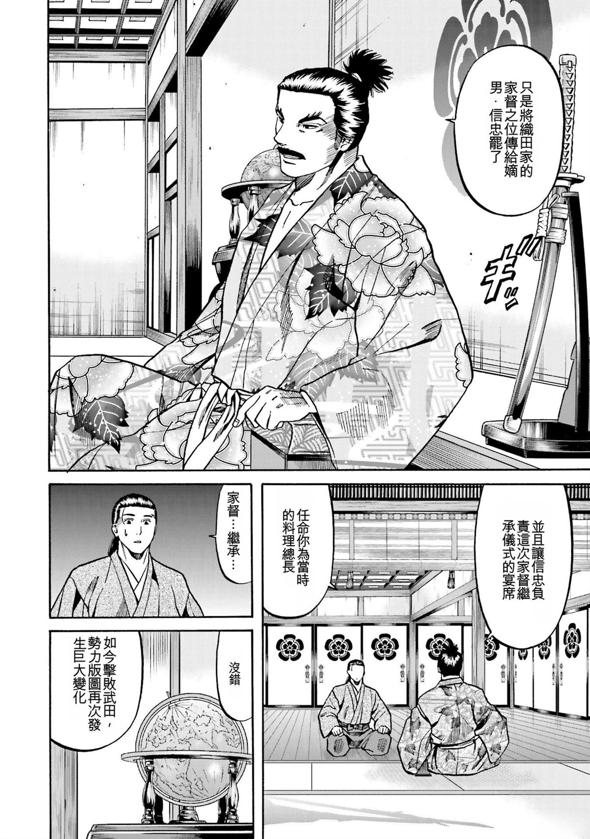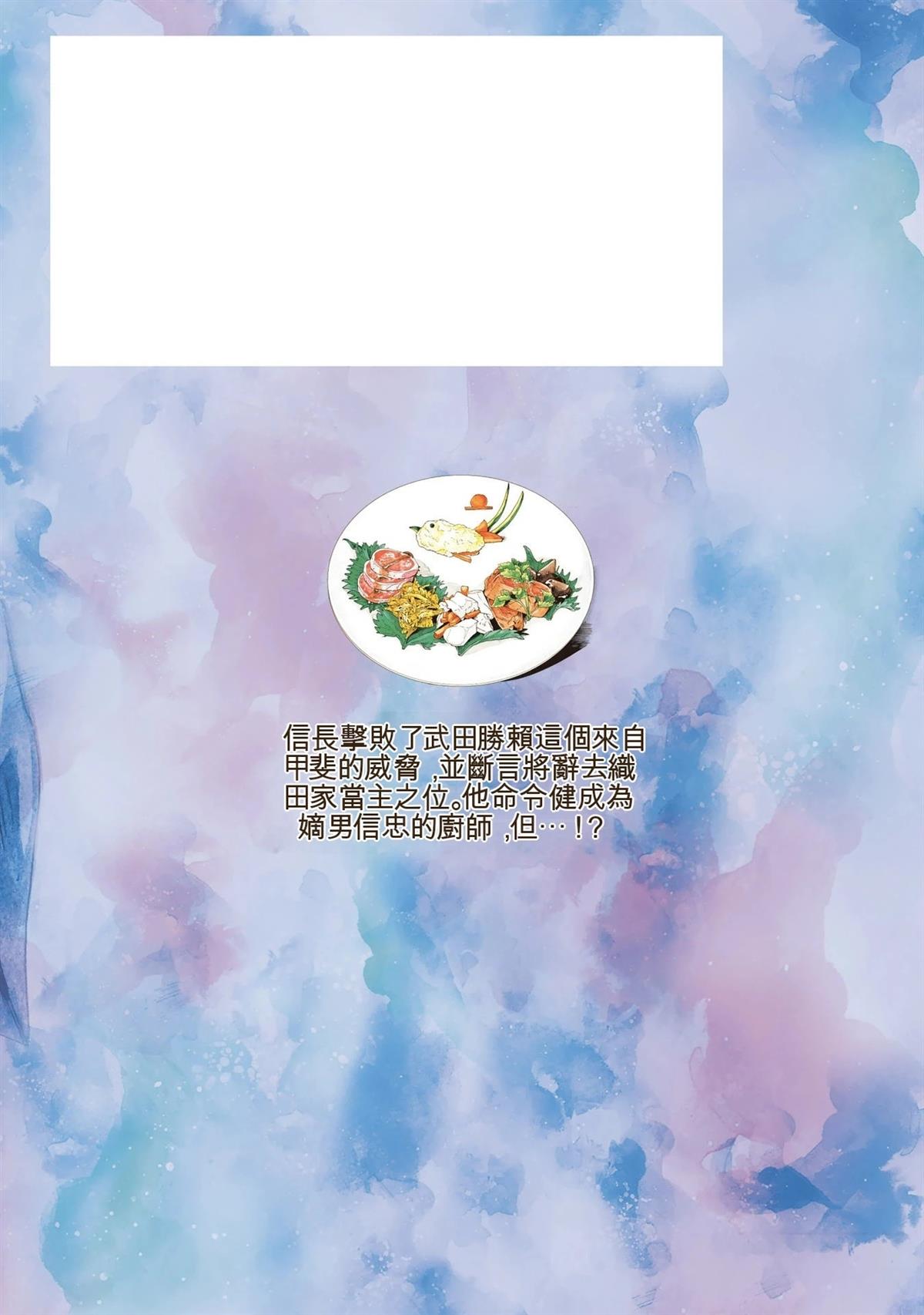 信长的主厨漫画 ,从昏迷中醒来的年轻人“健”,发现自己竟然身处于战国时代! 平成年间出生的年轻厨师,在这战国乱世之中,要如何生存下去? “健”有著自己的觉悟。 放马过来吧,战国! 我绝对要活下去!