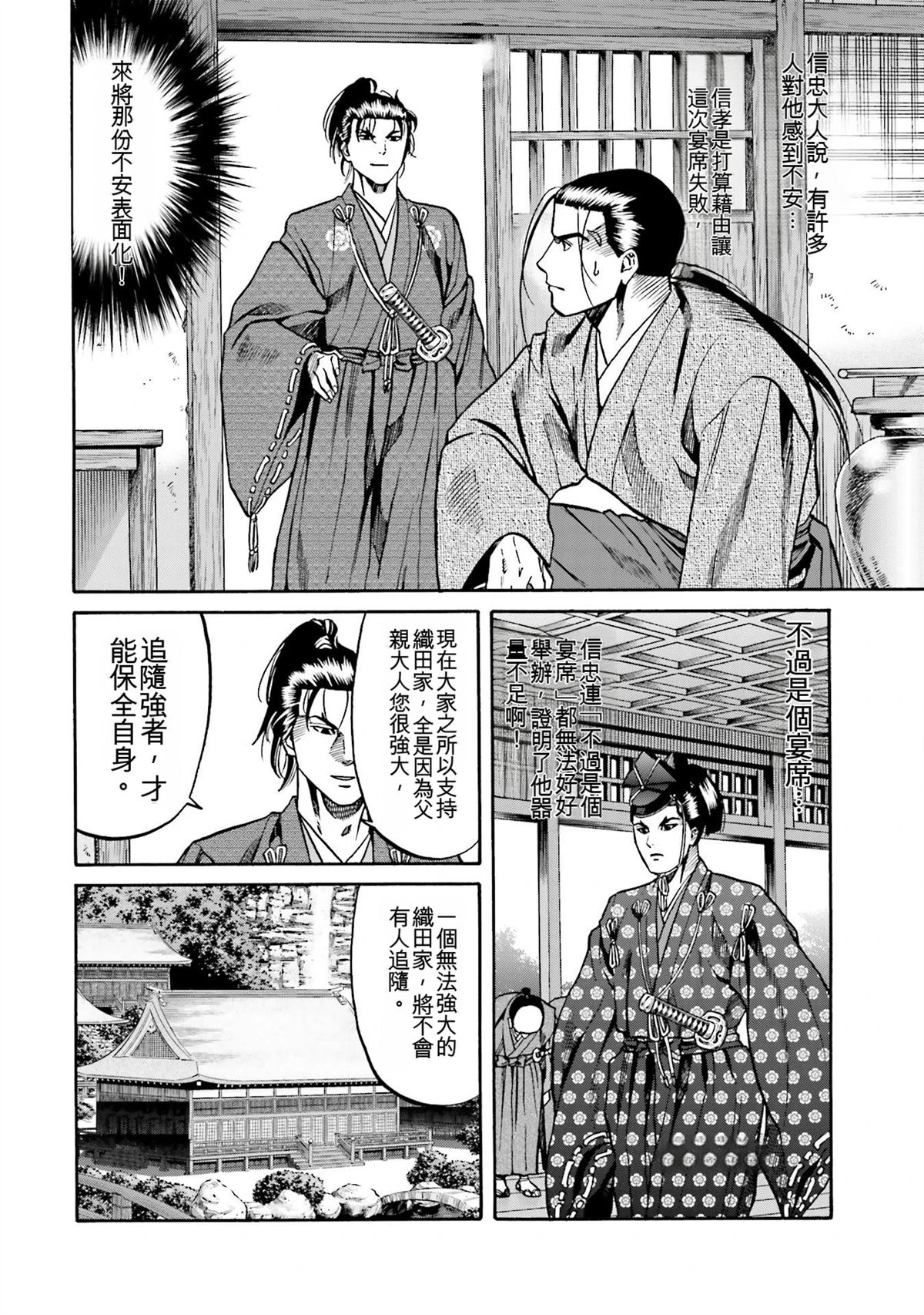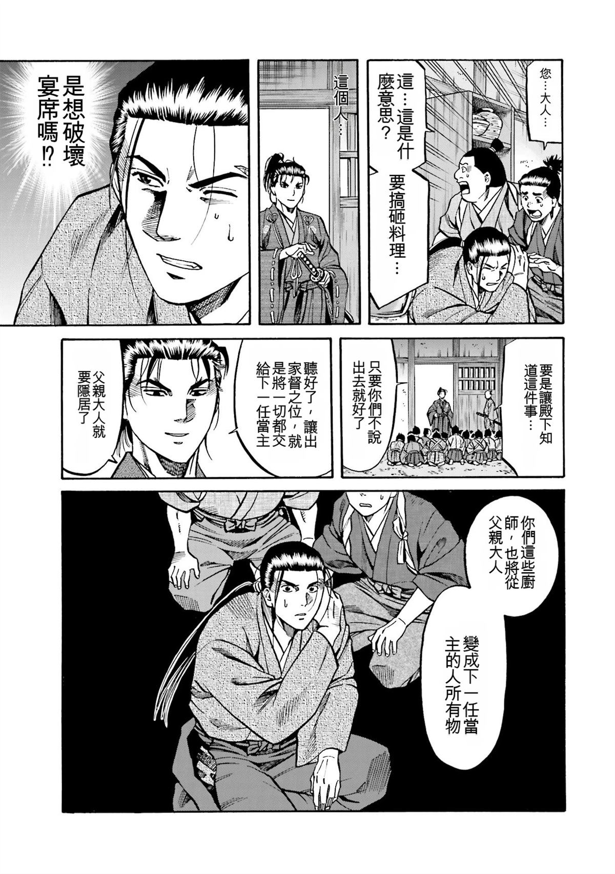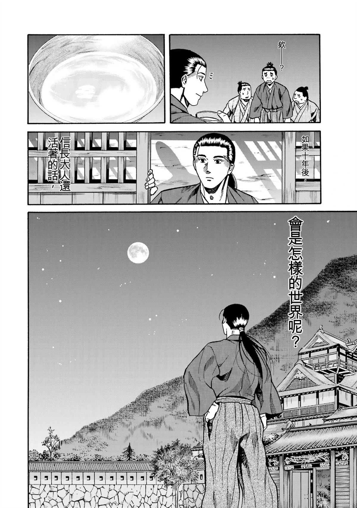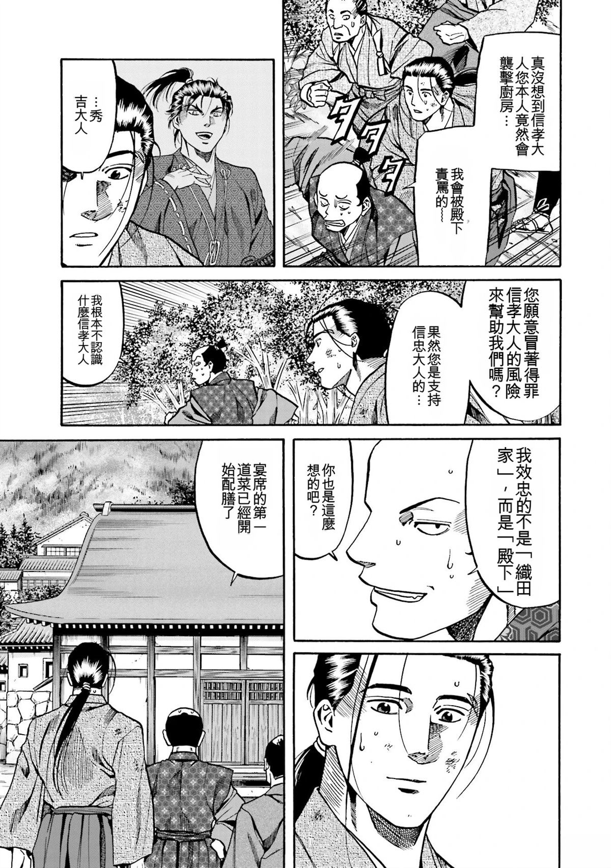 信长的主厨漫画 ,从昏迷中醒来的年轻人“健”,发现自己竟然身处于战国时代! 平成年间出生的年轻厨师,在这战国乱世之中,要如何生存下去? “健”有著自己的觉悟。 放马过来吧,战国! 我绝对要活下去!